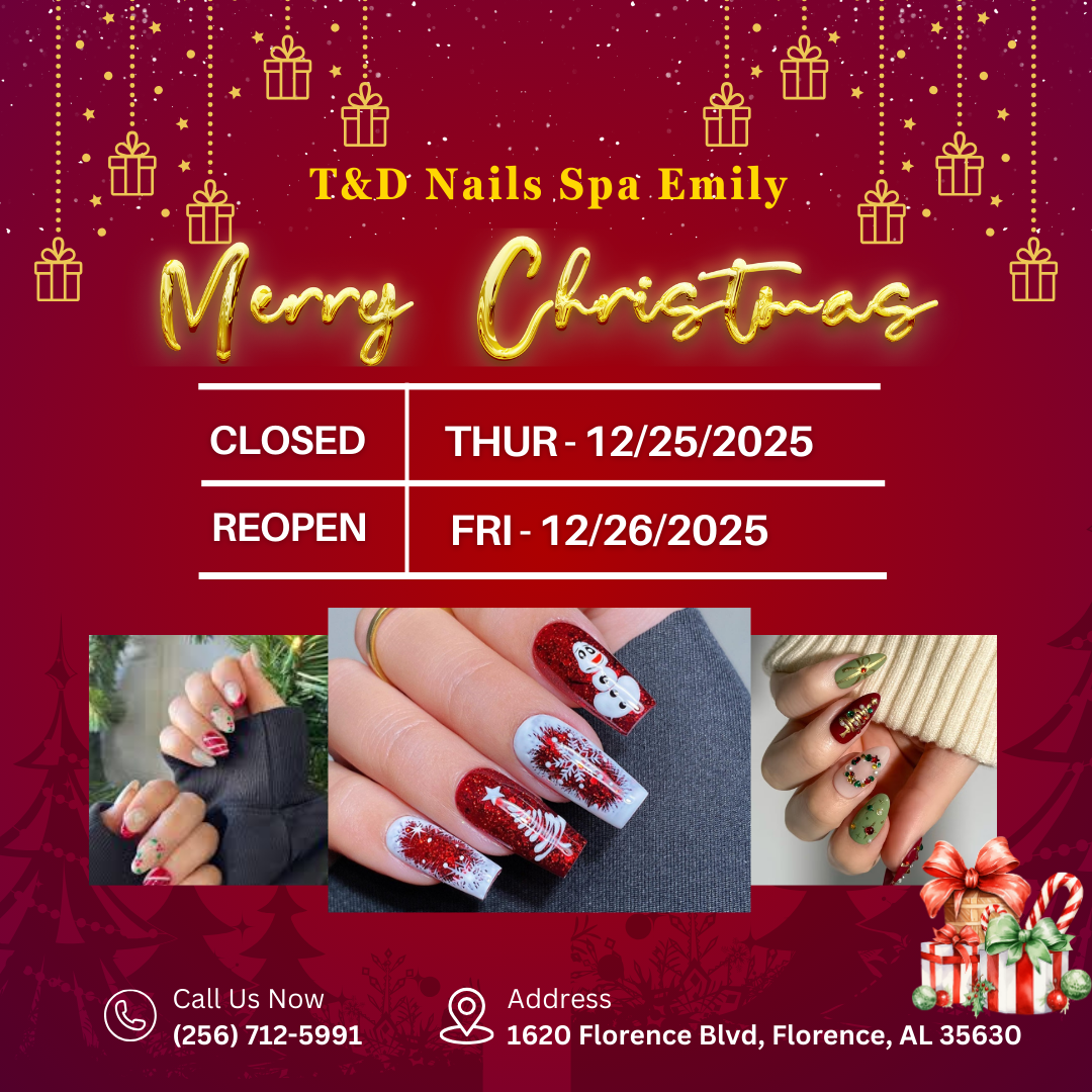 Are you looking for a reliable nail salon to perform nail and spa services? Look no further, T&D Nails Spa Emily is the ideal location. Visit us at 1620 Florence Blvd, Florence, AL 35630 for beauty treatments and find yourself looking even more beautiful with a stylish look! Come experience everyday serenity at our nail salon, a place of relaxation and rejuvenation.